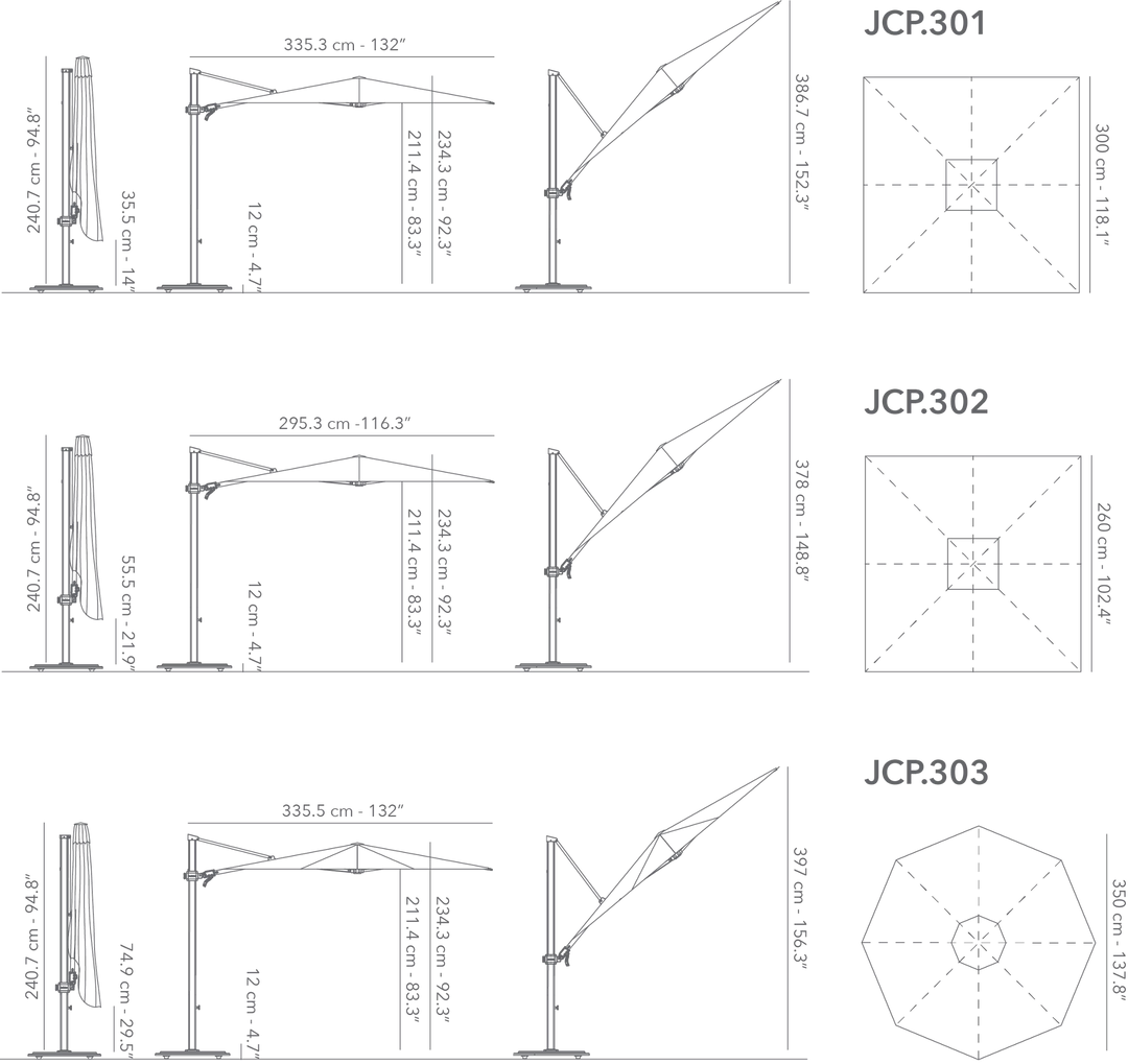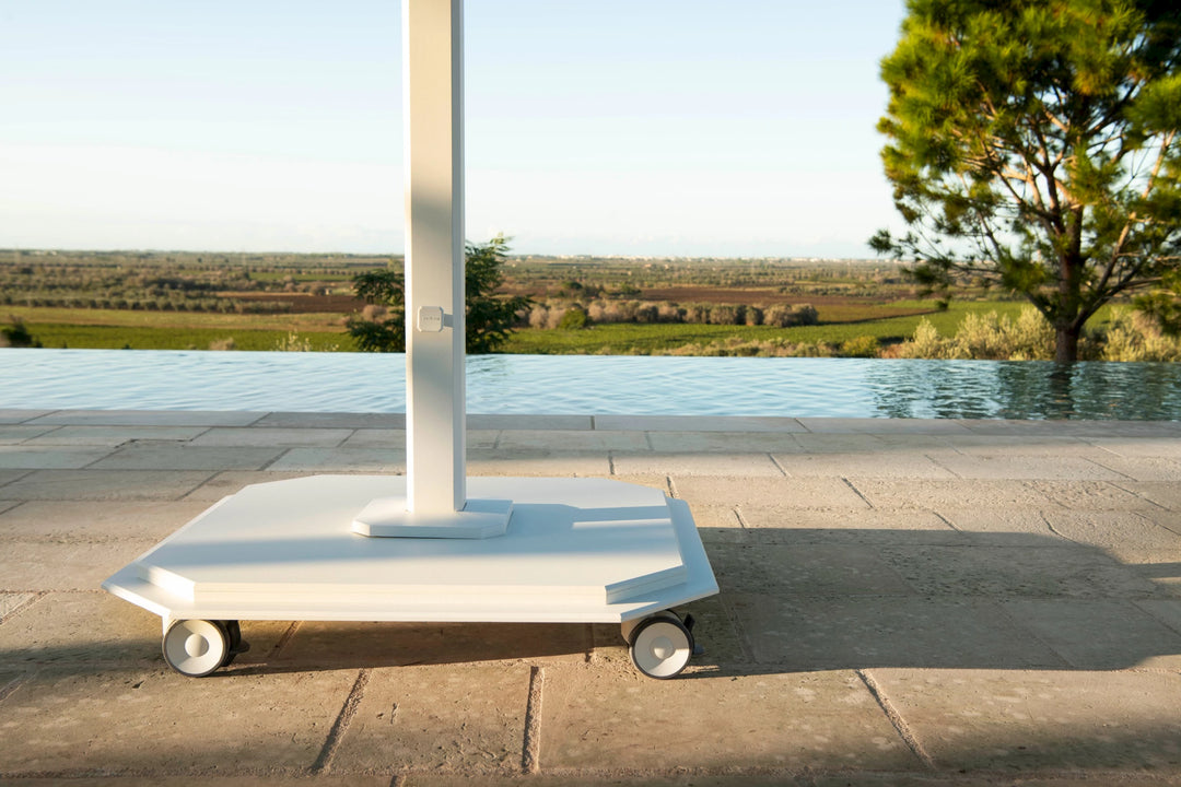 Alle onderstellen uit de Caractère-collectie zijn ontworpen en gemaakt in België. Ze zijn gemaakt van thermisch verzinkte staalplaten met een dikte van 15 mm. De voet heeft vier elegante wielen die 360° kunnen draaien, elk met een rem om de paraplu op zijn plaats te houden. De wielen zijn al op de basis gemonteerd.