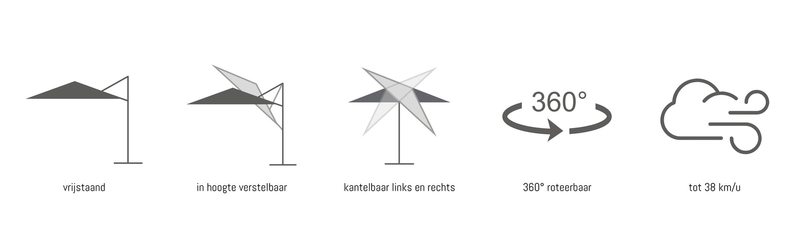 Montage: De montage van de parasolvoet is altijd inbegrepen. Wil je dat we de volledige parasol monteren? Dat kan voor een supplement van €50 (te selecteren bij de verzendopties).